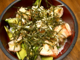 6.丼にご飯を盛り、アボガド・海老と交互に並べる