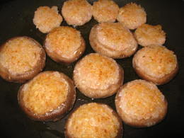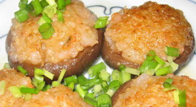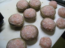 細かくした石突きと海老を、つなぎ(卵白or片栗粉)で、固め、椎茸に詰めます。