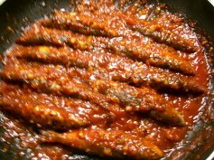 *小鰯、テキトーに粉をまぶし、カリッと香ばしく揚げておく。 *ニンニク・葱・生姜をタップリみじん切りにして、 胡麻油で焦げないように弱火で炒める。 *トマト・ソースを足す *豆板醤を足す *お酒を少々足す *蜂蜜を少量足す *水溶き片栗粉で絡める *ソース↑に揚げておいた鰯を入れ、絡める