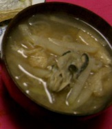 今、我が家でハマっている、お味噌汁です。 ウチは合わせ味噌です。 この場合、昆布で出汁を取ります。 大根を短冊に切り、水から入れ、煮ます。 煮立ったトコロに、しらたきを入れ、洗った牡蠣を入れます。 (↑は、油揚げも入ってます) 牡蠣と大根・・・甘くておいしい〜☆