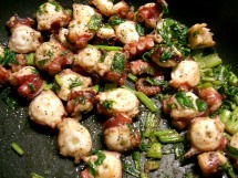 にんにくとタコをオリーブオイルで炒め、そこにセロリの葉っぱを入れます。