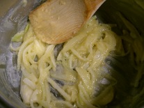 そこへ、そのまま青菜を入れてしまい、混ぜましょう〜