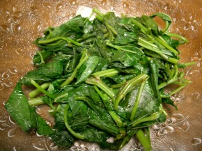 モロヘイヤをザク切りし、フライパンに蓋をして蒸し炒めする。
