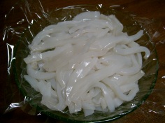 1、烏賊の胴の部分は、細く切って、烏賊そうめんにする。