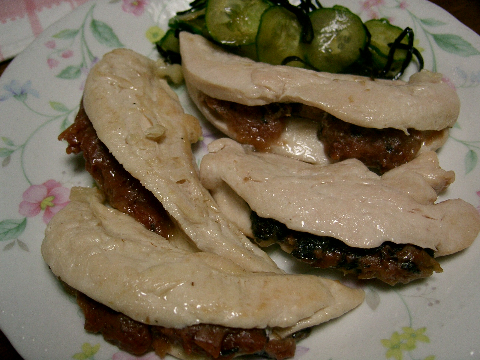 ささ身に包丁で切れ目を入れ、梅肉を挟みます。