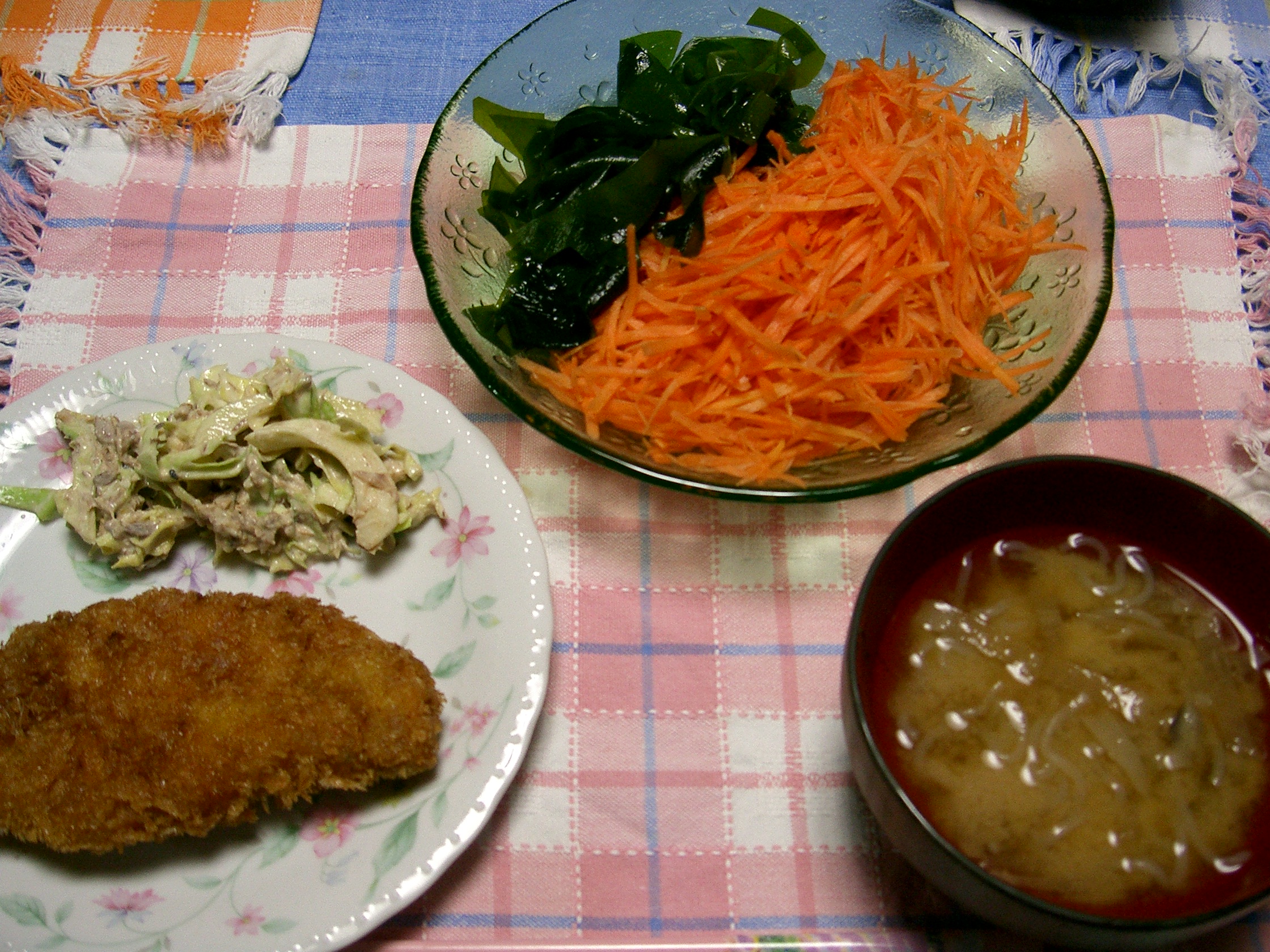 キャベツ・スプラウト2種・ブロッコリー・人参 生姜・茸5種ご飯・水菜・トマト・チコリ キャベツ・パセリ・ワカメ・人参・大根・あおさ